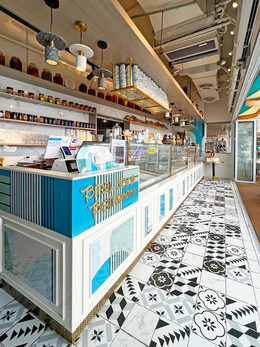 The interior layout prioritizes functionality and social engagement. A gracefully curved bench wraps around walls and pillars, complemented by modular D-shaped tables that allow versatile configurations. The café’s open design connects the kitchen, bakery, and ice cream lab through expansive glass partitions, allowing them a glimpse of the crafting action.