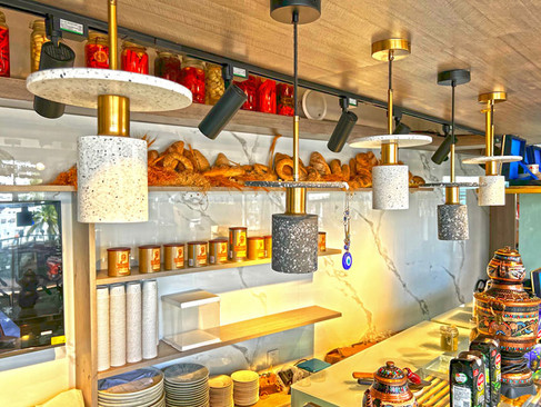 Upon entering, guests are greeted by the bakery display and bar counter, where Turkish-inspired geometric tile designs create a striking floor gradient from the entrance into the café, gradually transitioning from a bold density around the counter to a softer white tile in the seating area. This gradient not only distinguishes the space but also guides visitors deeper into the café. Along the walls, we introduced a custom geometric composition, inspired by arched Turkish motifs and abstracting skyline silhouettes. These panels establish a branded visual language that extends into the logo, menu, and other graphic elements.